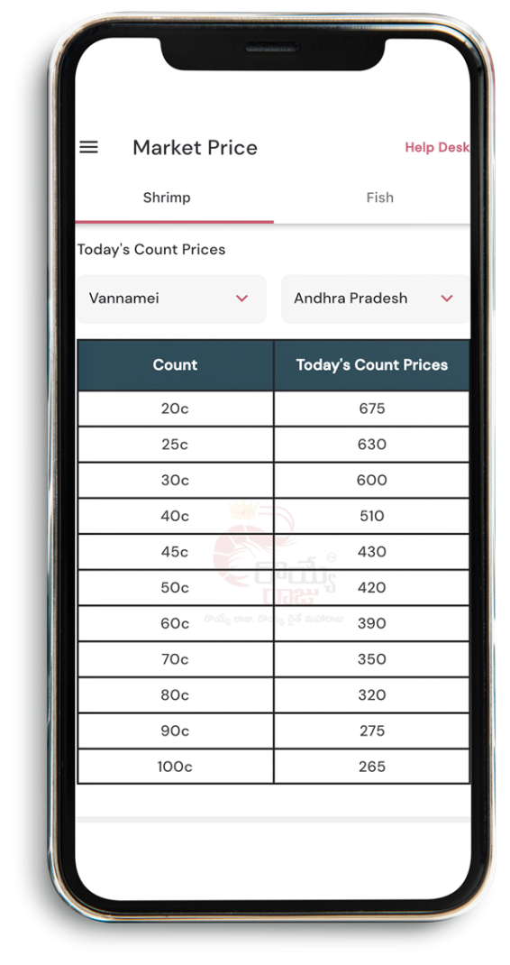 Our Royye Raju mobile application is designed to be an invaluable, comprehensive resource for everyone in the aquaculture ecosystem. This visual, user-friendly guide encompasses insights and features that farmer can use to reap a profitable crop and get one step closer to sustainable farming practices. The application considers the date, time and geographical details of the user to provide contextual experiences.