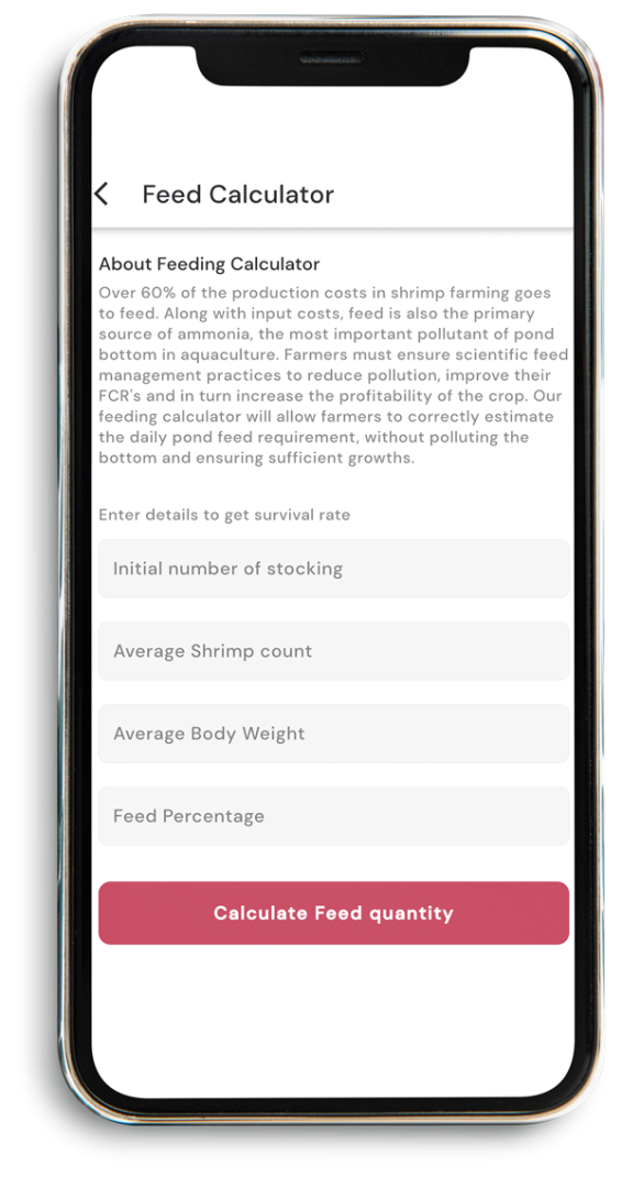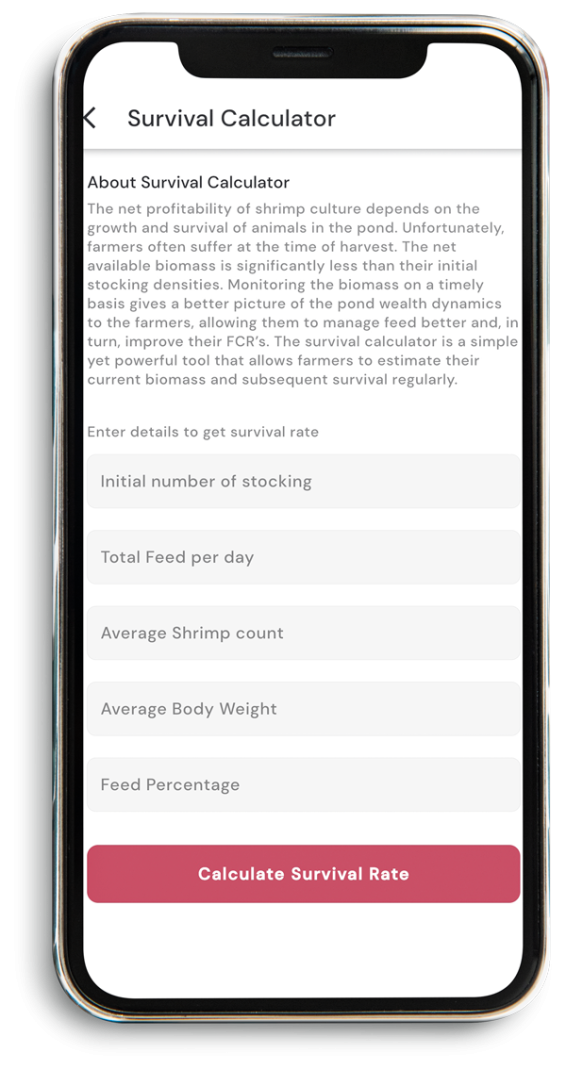 Survival and growth have the greatest impact on the economic performance of shrimp production, and correct feeding is essential for both (Wyban et al. 1989). Monitoring the biomass of the crop regularly is an important aid in improving the food conversion ratio (FCR) and maximizing the growth rate, survival rate, yield and good management practices in shrimp farming. Our Survival Calculator is simple tool that helps farmers calculate how many shrimp is stocking in their pond.